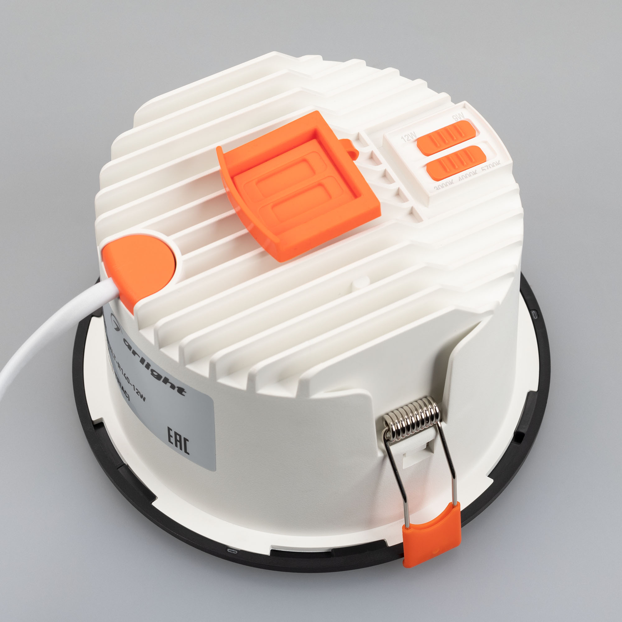 Встраиваемый светильник даунлайт с изменяемой мощностью и цветовой температурой. Мощность 9-12 Вт, св. поток 870-1200лм, 100 лм/Вт, цветовая температура 3000-4000-5700 K, CRI>90, угол 40°, напряжение питания 230 В. Чёрный круглый корпус, степень защиты IP54. Размер: диаметр 140 мм, высота 80 мм. Монтаж встраиваемый, установочное отверстие: диаметр 122-127 мм. TRIAC-драйвер, пульсация <1%.