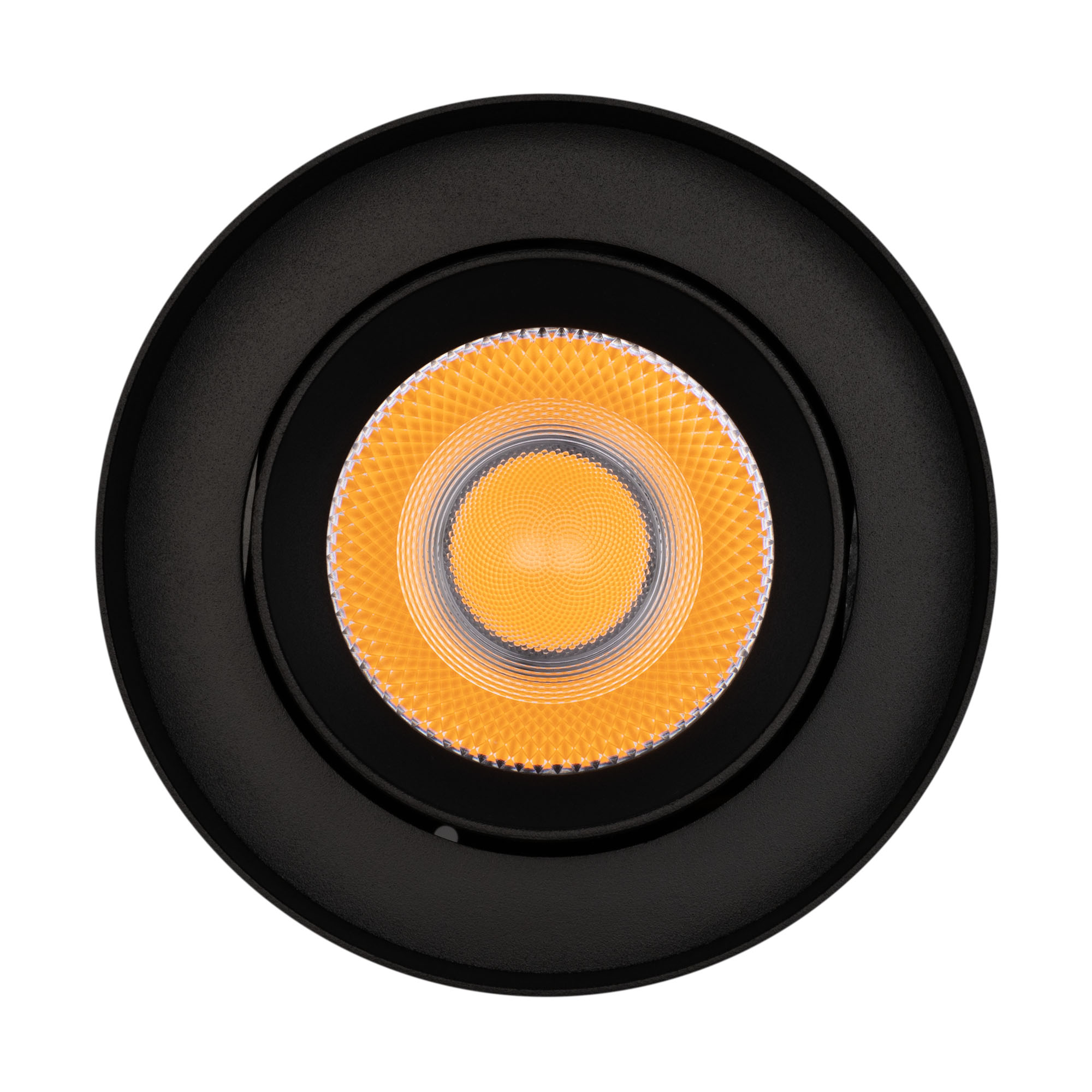 Накладной интерьерный светильник. Мощность 24 Вт, св. поток 2400 лм, 99 лм/Вт, дневной 4000 K, CRI>90, угол 24°, регулируемое направление луча 40°(20+20), поворотный световой модуль вокруг своей оси на 340°, UGR <11, напряжение питания 230 В. Чёрный круглый корпус из алюминия, степень защиты IP54. Размер: диаметр 132 мм, высота 165 мм. Монтаж накладной. Драйвер 27-45 В, 600мА, пульсация <1%.