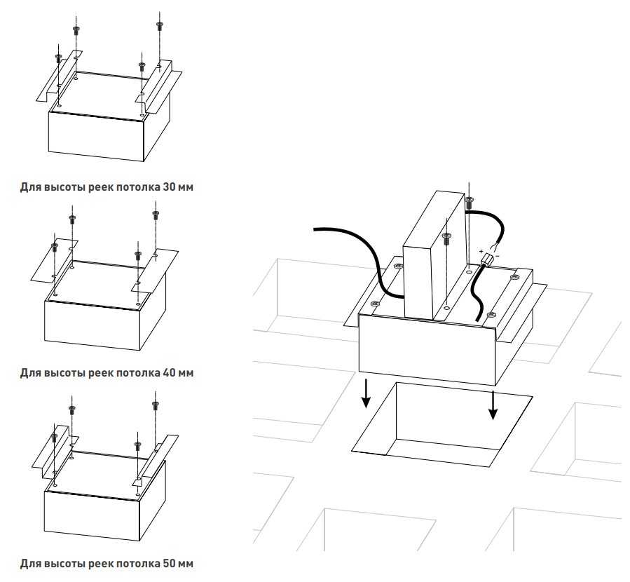 Прикрутите к светильнику монтажные планки (входят в комплект поставки), как показано на схеме ниже. Тип и вариант установки монтажных планок осуществляется исходя из высоты реек потолка «Грильято» (прямые планки для реек 40 мм, Z-образные планки для реек 30 или 50 мм).